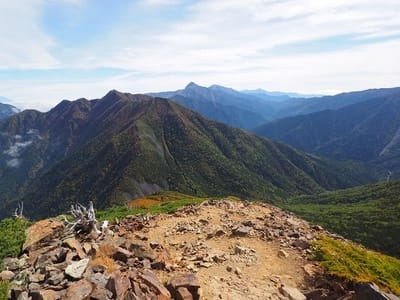 赤石山脈の山々を望みつつ稜線を歩きます。