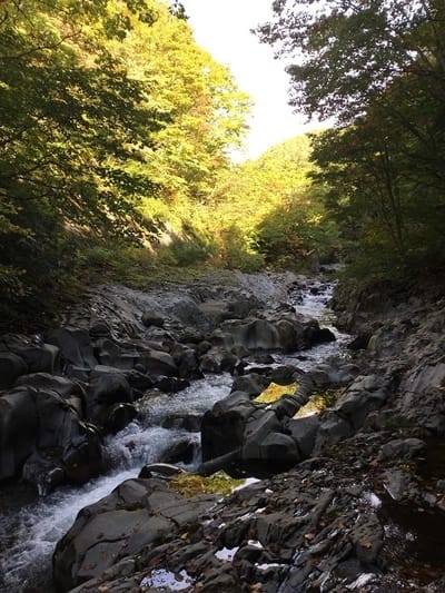 中津川渓谷に架かる橋から見た中津川渓谷。