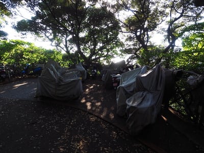 原付や自転車が沢山停められており、