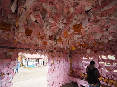 駅舎内には願い事の書かれた夥しい数の紙が貼られています。
