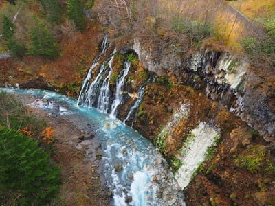 見ての通り美瑛川に築かれた堤防に水が溜まって生じた人造池です。