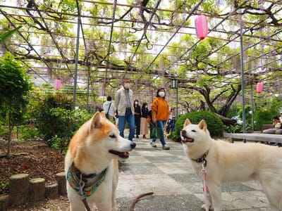 藤を眺める愛犬達。