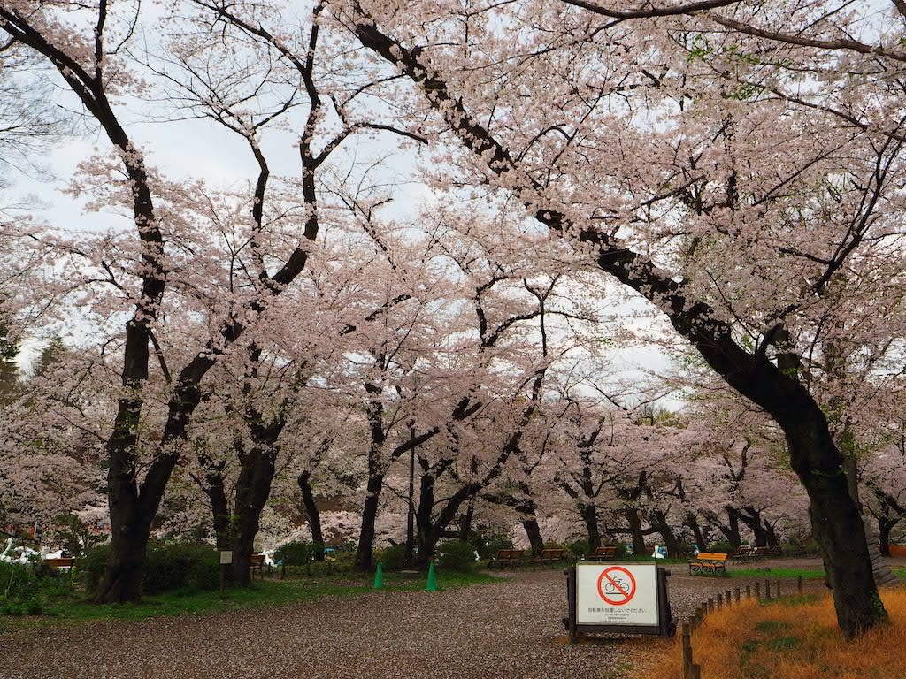ベンチが並ぶ一角は飲食を伴う花見を防ぐ為に