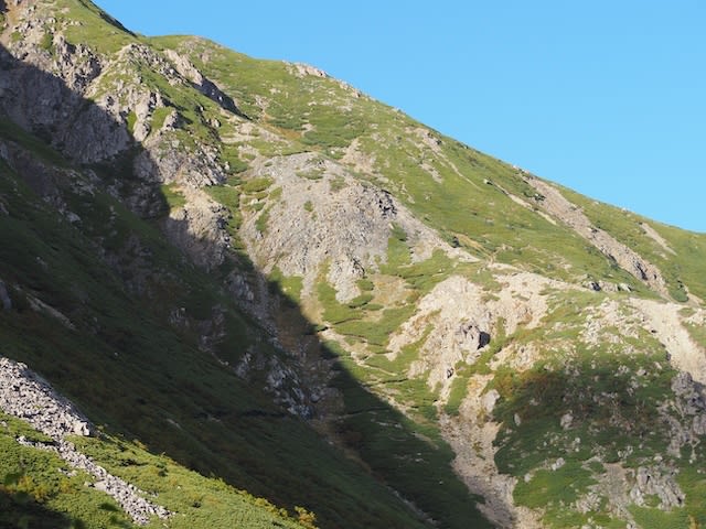 北アルプスとは違う、如何にも脆そうな稜線です。