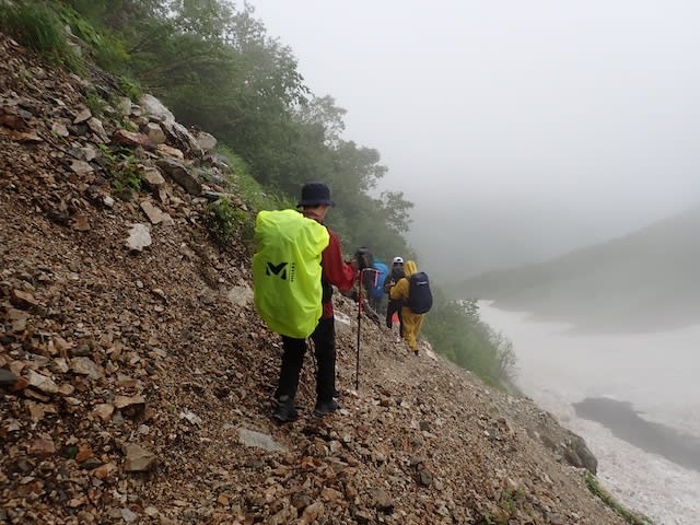 この山行で一番恐怖を感じた雪渓横のザレ場は