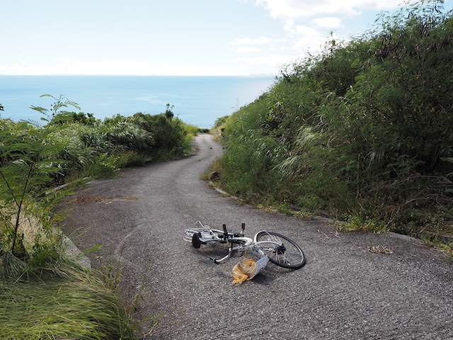 激坂を登り返す途中でウィリーしかけて派手に転んだ図。