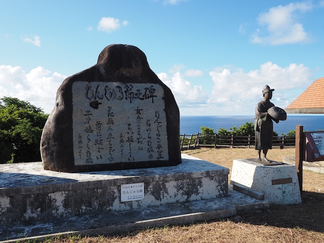 粟国島発祥の民謡で、隣の石像が笠を手に持っているように
