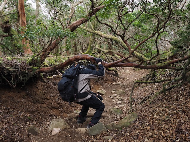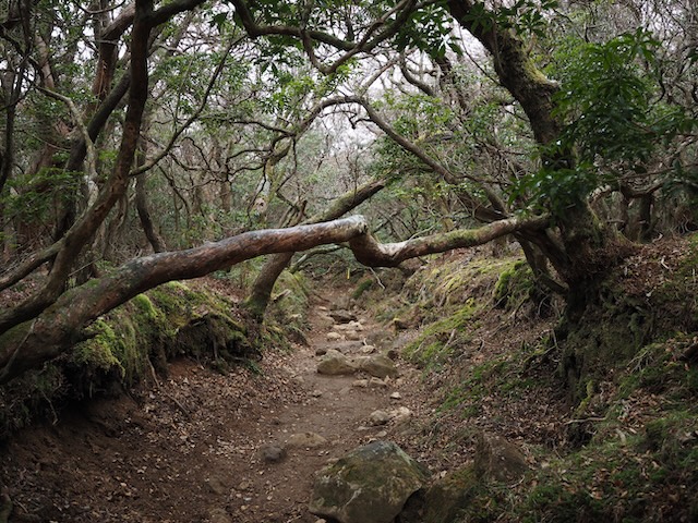 登山道に覆い被さっている立派な木々が