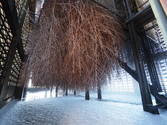 風通しの良い場所に吊るされた竹枝を伝って海水を流し続けることで